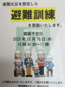 特養市川あさひ荘 夜間火災を想定した避難訓練 2025/12/16 先日、夜間帯の火災を想定した避難訓練を行いました 消防署、消防設備業者さんにも立ち会っていただき、利用者様も職員の 指示に従いながら、無理なく避難誘導に参加されました 乾燥による火災等が危ぶまれる時季なので、消防署、消防設備業者さんに いただいた助言を参考に、火災の予防に努め、安全な生活が送れるように 支援していきたいと思います